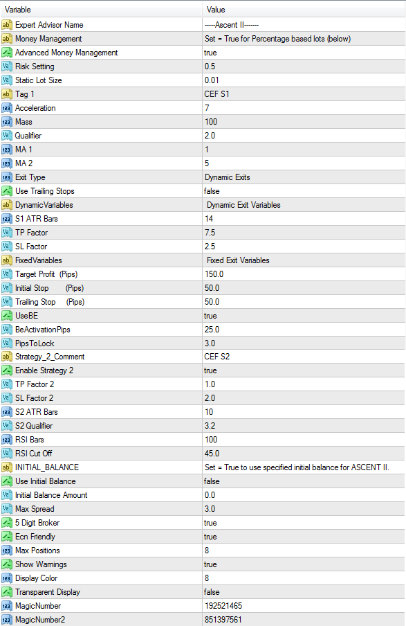 Although the default settings are optimized for the EURUSD 15-minute chart, ASCENT II offers flexibility to traders. All variables within the EA are exposed, allowing users to tweak and optimize settings according to their specific trading needs and to apply the system across various financial instruments.