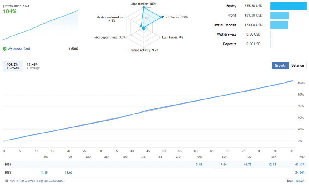 Historical data provided by its creators claims that the EA demonstrated stable performance when tested on currency pairs from 1999 through 2023. However, as with any past performance statistic, traders should carefully interpret these historical tests and remain aware that past performance does not guarantee future results.