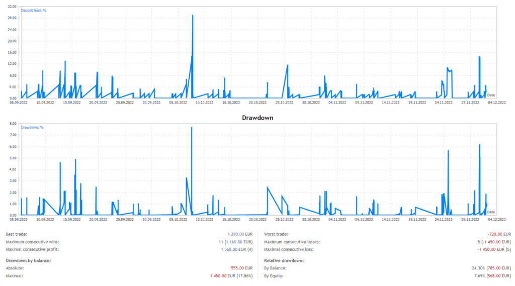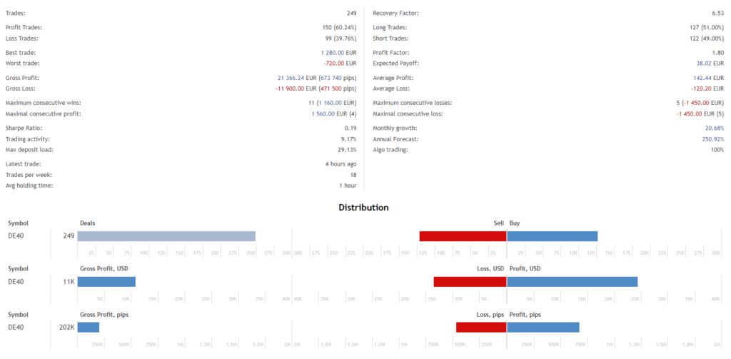 Dax40 EA trades actively from 9 AM to 8 PM Frankfurt time, aligning with the DAX market hours. It monitors the index’s volatility and movement during these hours and initiates trades based on strong momentum, executing trades at the opening of the next bar.