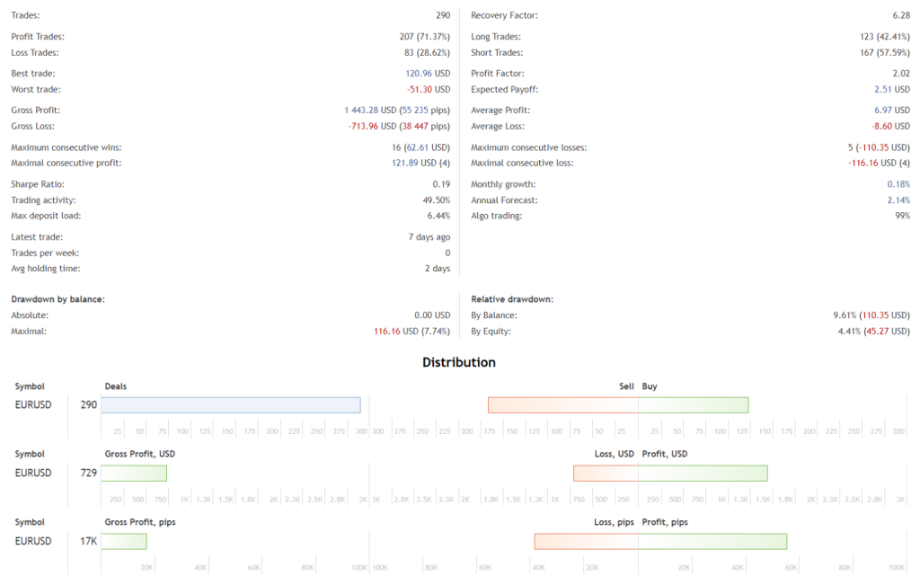 EURUSD EA is specifically optimized for trading the EURUSD pair on the H1 timeframe. This specialization allows the EA to concentrate on the unique characteristics and trading patterns of this currency pair within this specific timeframe.