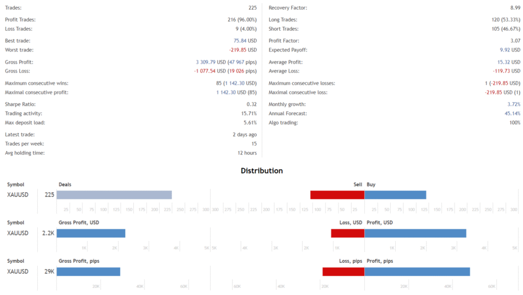 Trade management is critical to the GoldMiner MT4 Gold EA’s strategy. Each position has a fixed or trailing Take Profit and a fixed Stop Loss from the onset. While these values can be adjusted, the developers recommend adhering to the default settings, which have been optimized over extensive backtesting periods. The system maintains a disciplined approach by allowing a maximum of one open position at a time per symbol, in addition to any potential recovery trades.