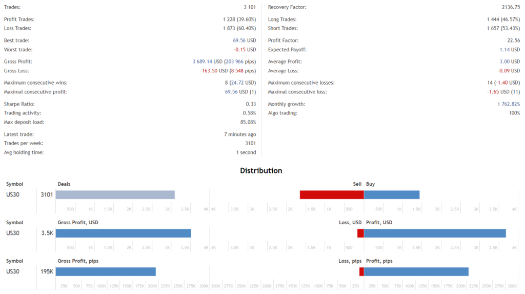 - Best Trading Conditions: This EA performs optimally on indices such as US30 (DJ30, WS30) or GER30 (DE30) and is most effective on M1 or M5 timeframes.