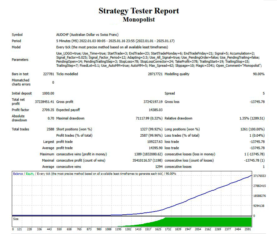The Monopolist EA is a Scalping Expert Advisor designed to work with short-term trades in the forex market. Its strategy is based on price action, aiming to make fast decisions while opening trades. This approach is intended for scalping, a trading method that focuses on making small profits from quick trades.