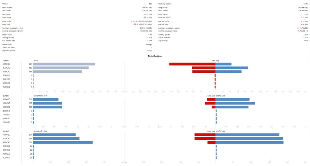 The EA targets popular pairs such as AUDCAD, AUDNZD, and NZDCAD, utilizing correlation arbitrage opportunities to maximize returns. This selection is strategic, catering to traders looking to exploit inefficiencies within these correlated markets.