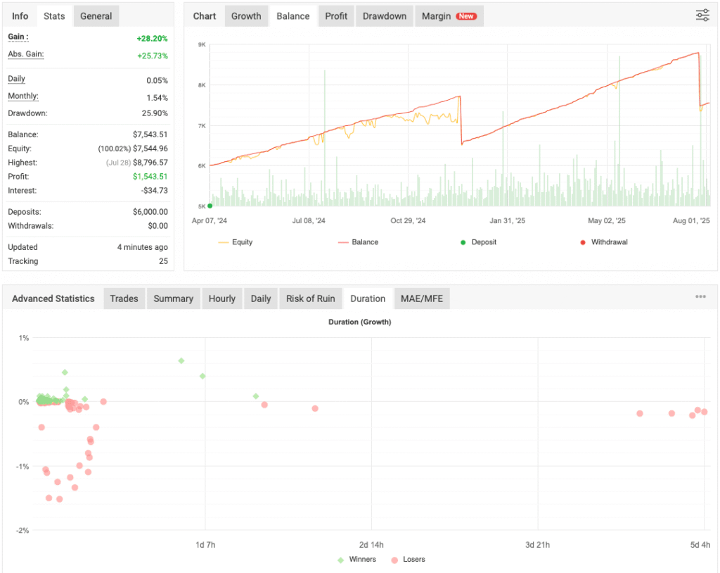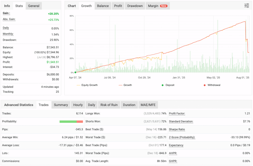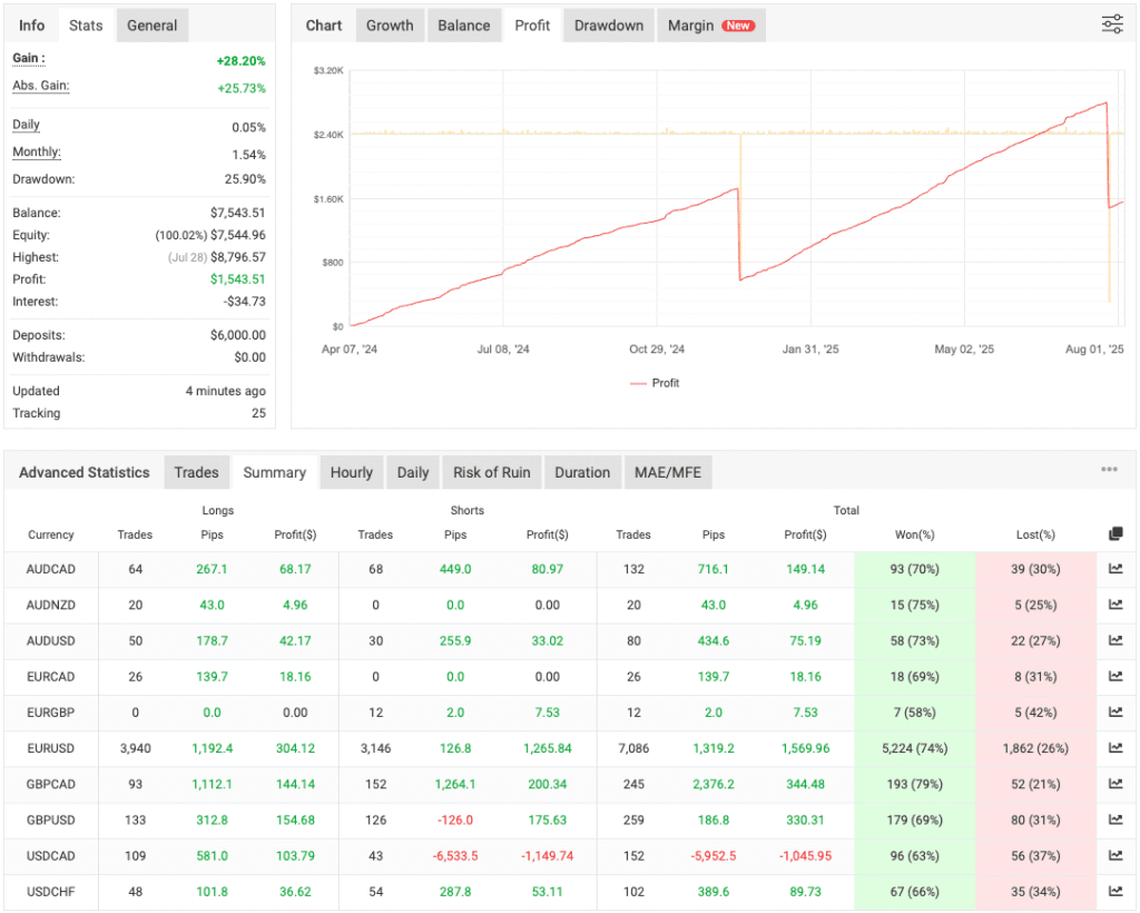 - Activity – An average of roughly 15 trades per day (this can vary with market volatility and filters)