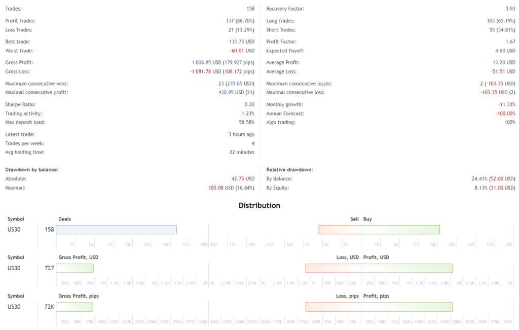 The Titan Diamond EA is an EA specifically designed for trading the US30 currency pair. By concentrating on this single pair, the EA aims to thoroughly understand its price behavior, which can potentially lead to more informed trading decisions.
