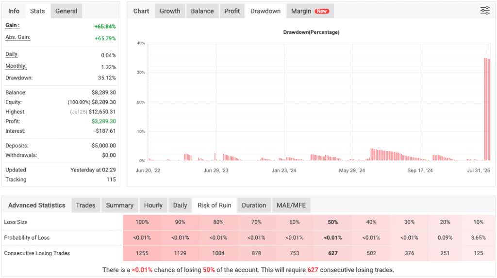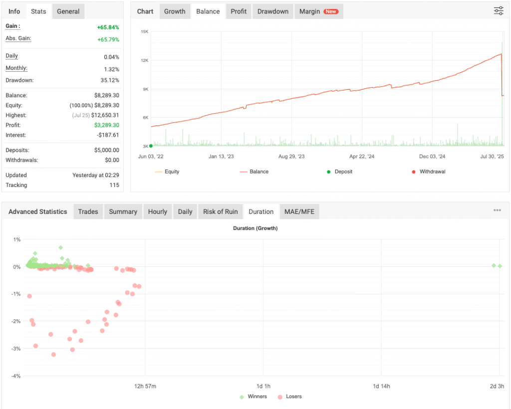 On average, Free Forex EA places around 5 to 10 trades per day, adding up to approximately 25 to 50 trades per week. The average duration of each trade is about 1.5 hours, reflecting its short term, high activity approach.