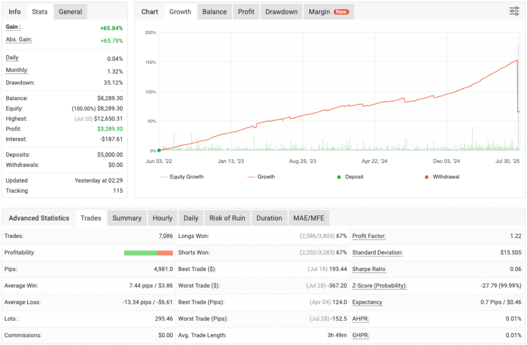Instead of targeting large profits from a few trades, Trend Scalp EA accumulates gains through frequent, smaller trades, a style that can be preferred by those who favor intraday market activity. The expected gain per profitable basket of trades is modest, generally between 5 and 15 pips.