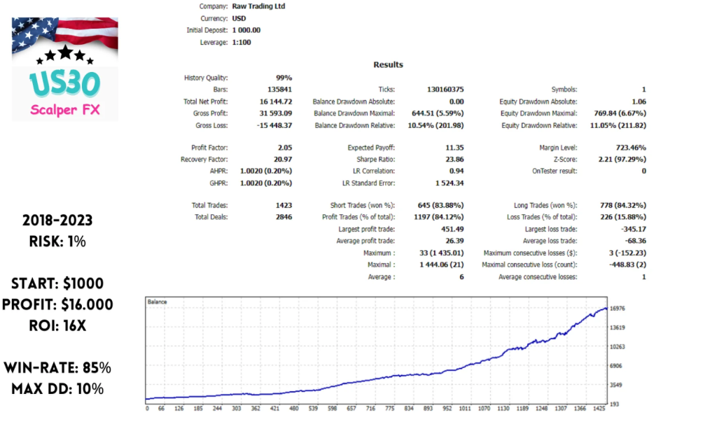 The US30 Scalping Expert Advisor (EA) stands out as an innovative automated trading solution, specifically tailored for scalping on the US30/DOW index. Renowned for its robust performance in the fast-paced financial market, the US30, also known as the US Wall Street 30 index, attracts traders aiming to capitalize on minute price movements.
