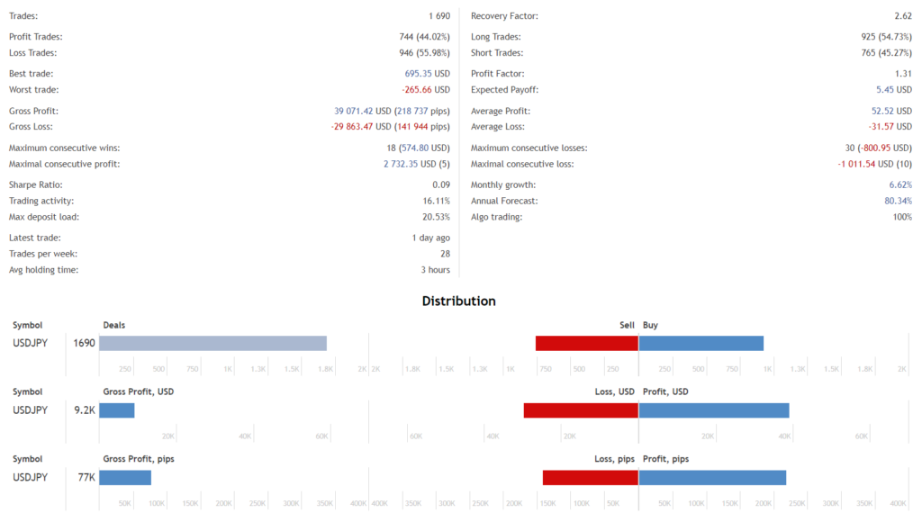 The USDJPY Robot boasts a solid trading history with MQL5 copy trading signals. As of the latest updates, this account has been active since December 2019 and shows an impressive average monthly growth of 20%, with a maximum drawdown of just 4%. This consistent performance underscores the robot’s reliability and effectiveness in safeguarding investments.