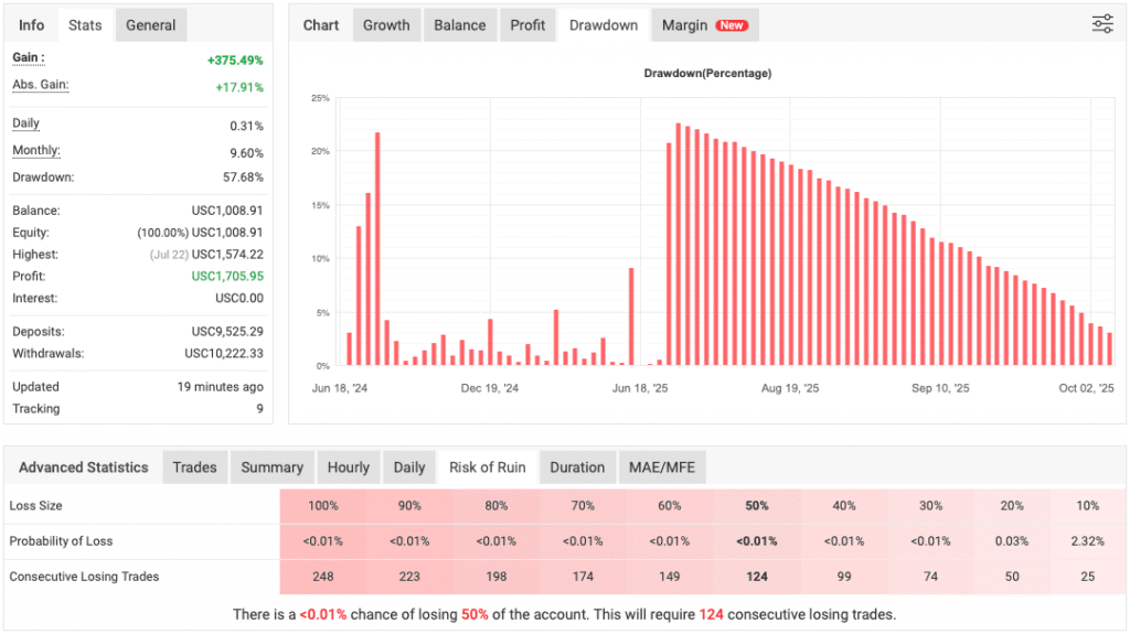 - Trade Duration and Risk – When the grid strategy is triggered, trades may remain open for a longer duration, sometimes hours. This phase increases exposure to market volatility and potential drawdown, especially if the market trends sharply in the opposite direction.